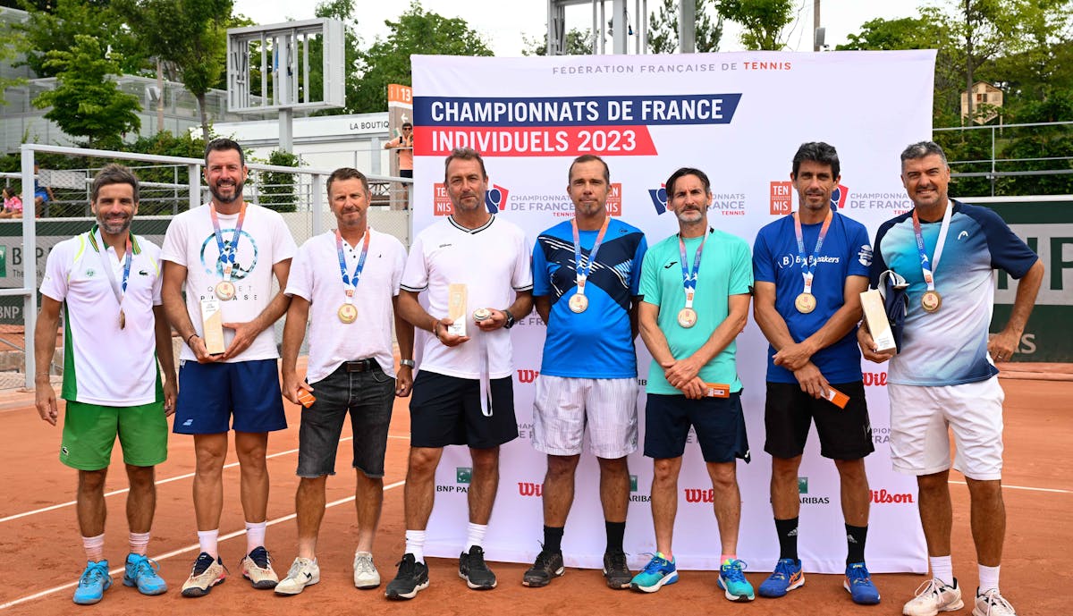 Les lauréats des finales simple et double des 45 et 50 ans messieurs, avec à gauche Arnaud Clément et à droite Benoît Hallé.