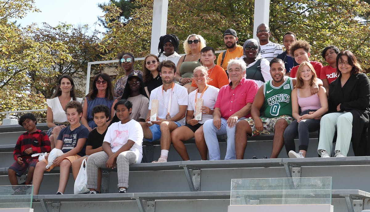 Les enfants de l'association Les Apprentis d’Auteuil, invités par BNP Paribas, avec les vainqueurs 2e série et Jacky Terreau, vice-président délégué de la FFT.