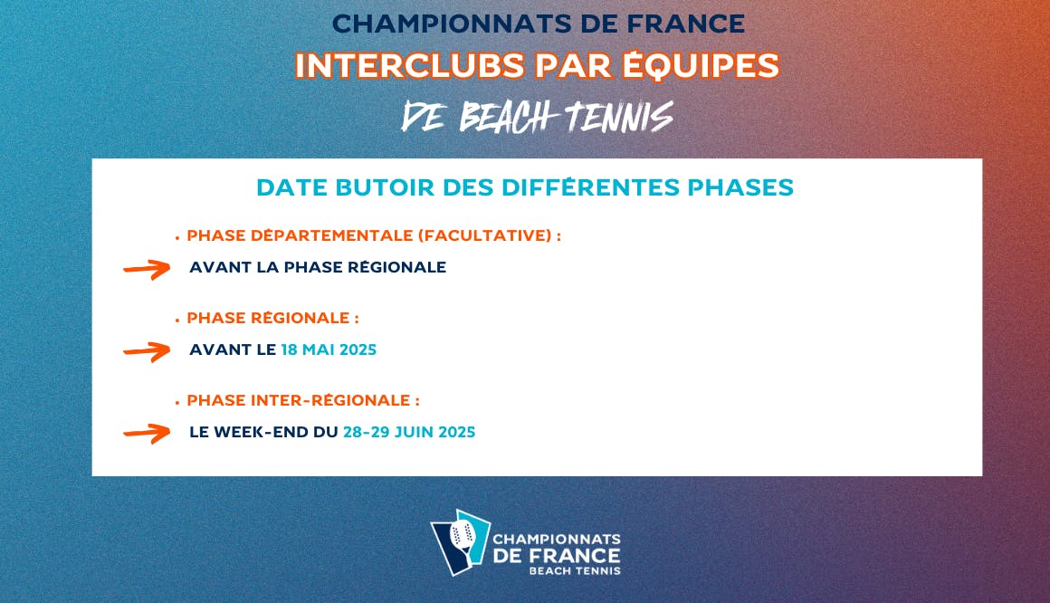 Contribuer au développement des clubs de beach tennis en France et valoriser leur travail par une compétition nationale qui se décline en phases régionales et interrégionales : c'est l'objectif de la nouvelle mouture des Championnats Interclubs par équipes, qui sera désormais ouverte sur trois catégories d’âge, U14, U18 et seniors.