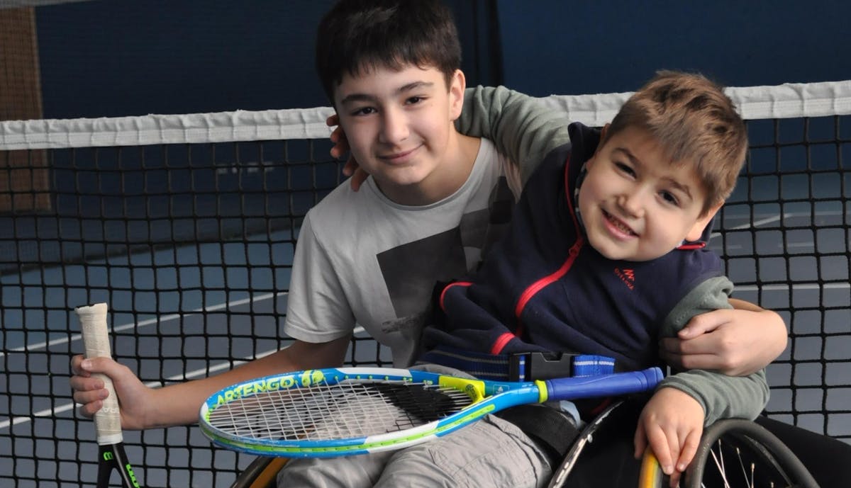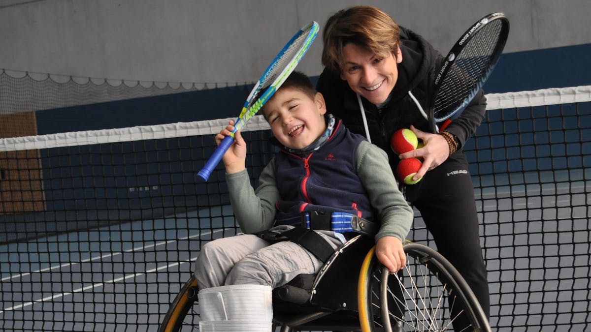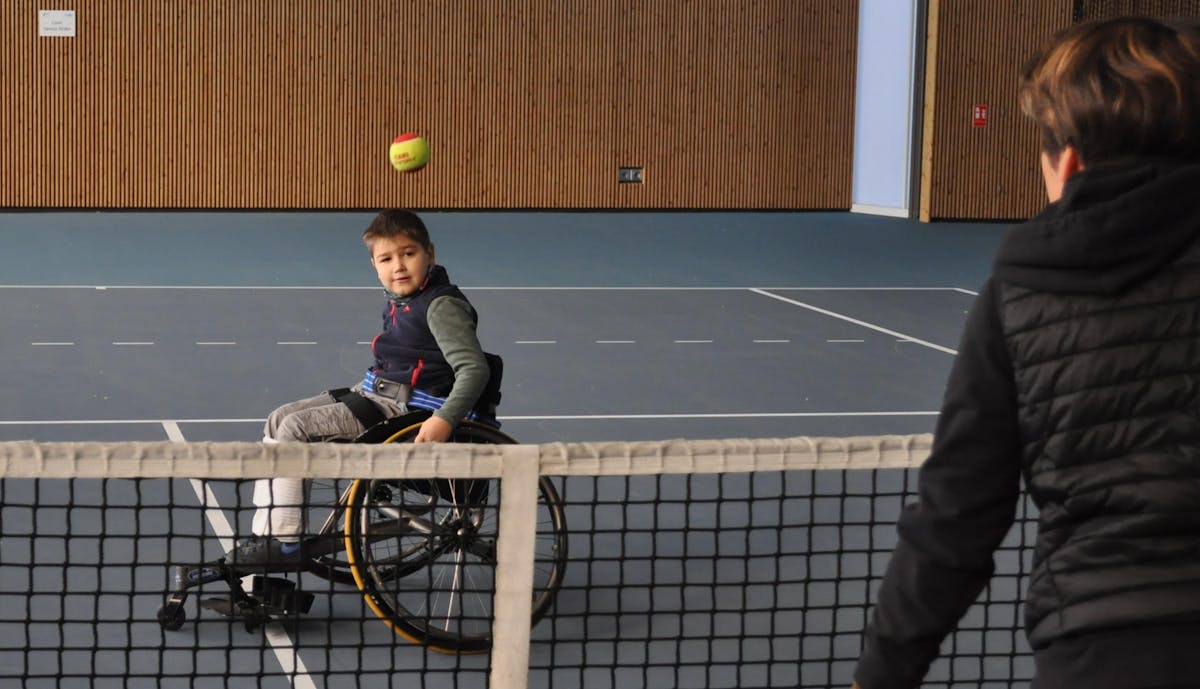 En quelques mois, Sabrina Euvrard Trible a mis en place des séances de tennis adaptées pour Gianni. Et très rapidement, ce dernier a souhaité jouer avec des rebonds. Seule possibilité : le faire jouer en tennis-fauteuil.