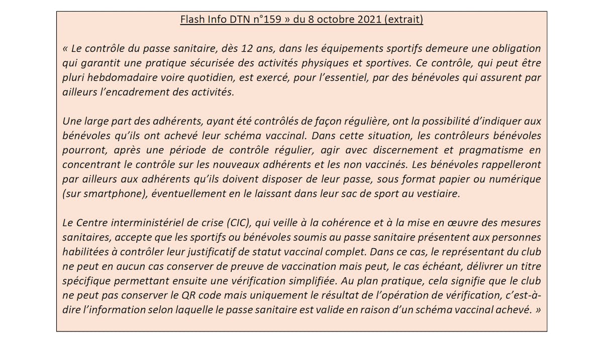 • Le ministère chargé des sports rappelle que le contrôle du passe sanitaire pour tous les visiteurs âgés de plus de 12 ans et 2 mois demeure une obligation dans les équipements sportifs.• Dans la mesure où il évoque un contrôle « pluri-hebdomadaire voire quotidien », on peut considérer que les contrôles par les clubs n’ont pas à être systématiques à chaque entrée, mais doivent néanmoins demeurer très réguliers.