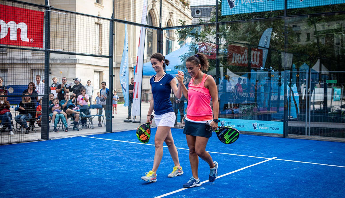 Chez les hommes, sur le court central, Robin Haziza, Jérémy Scatena, Adrien Maigret et Benjamin Tison ont assuré le spectacle. Des points magnifiques avec des sorties de terrain sous les yeux d'un public garni malgré la météo incertaine. Après 3 sets acharnés Robin Haziza et Jérémy Scatena l'ont emporté au tie-break du troisième (4/6 6/4 7/6).Sur l'autre court, les champions de France Bastien Blanqué et Johan Bergeron se sont logiquement imposés face à Thomas Leygue et Nicolas Trancard (6/1 7/5)Entre les matches, le public a pu profiter des pistes pour jouer et certains ont même pu échanger quelques balles avec les finalistes du jour.Rendez-vous à partir de 14h30 pour la finale dames suivie de la finale hommes. En raison de la pluie qui s'est invitée en région parisienne, les deux matches se joueront en intérieur sur les pistes du club Casa Padel à Saint-Denis.