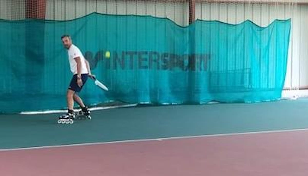 L'entraîneur utilise des rollers pendant ses cours de paratennis.