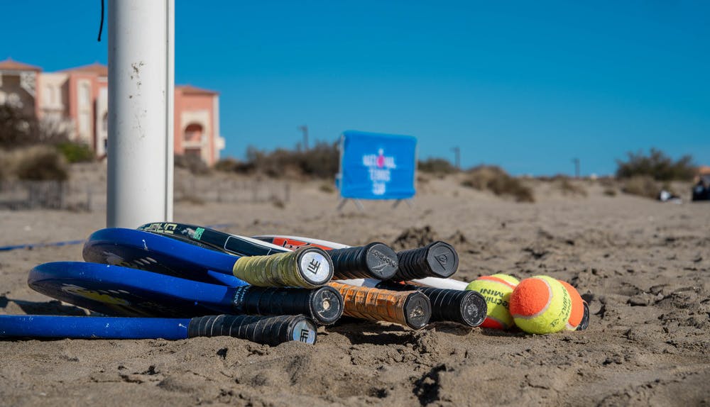 Le beach tennis se joue avec des raquettes pleines, sans cordage, fabriquées en graphite, fibre de verre ou Kevlar et dotées de petits trous pour favoriser la pénétration dans l’air. Les raquettes pèsent entre 300 et 390 grammes (adultes), et environ 240/290 grammes pour les jeunes.