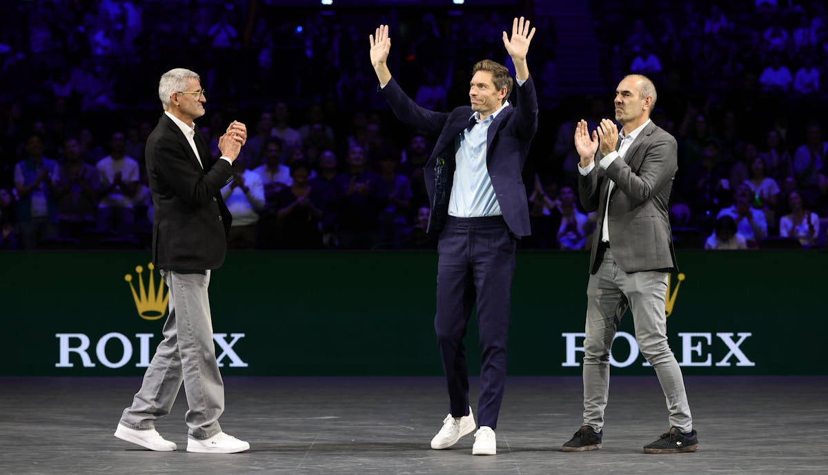 Le président de la FFT Gilles Moretton et le directeur du Rolex Paris Masters Cédric Pioline ont entouré Nicolas Mahut pendant cette céréminie qui a permis de retracer la belle carrière de l'Angevin, dont le dernier match en tant que joueur professionnel s'est joué mardi dernier, à Paris La Défense Arena.