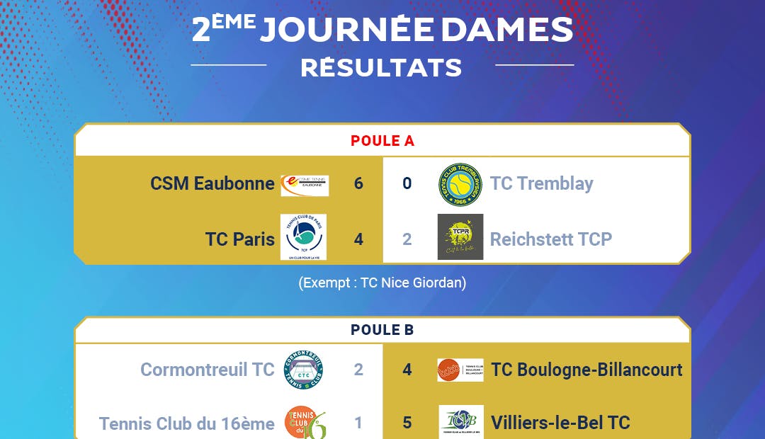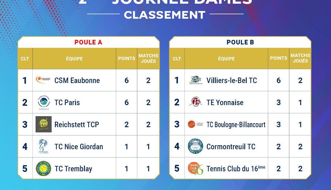 La poule A est largement dominée par deux clubs d’Ile de France. Après avoir tous les deux décroché un premier succès 5-1 lors de la première journée, Eaubonne et le TC Paris ont enchaîné ce mercredi avec une deuxième victoire. Un triomphe sans appel 6-0 pour les coéquipières de Sarah Rakotomanga Rajaonah face au TC Tramblaysien, et une victoire un peu plus étriquée 4-2 sur le TC Padel Reichstett pour les joueuses de la capitale.