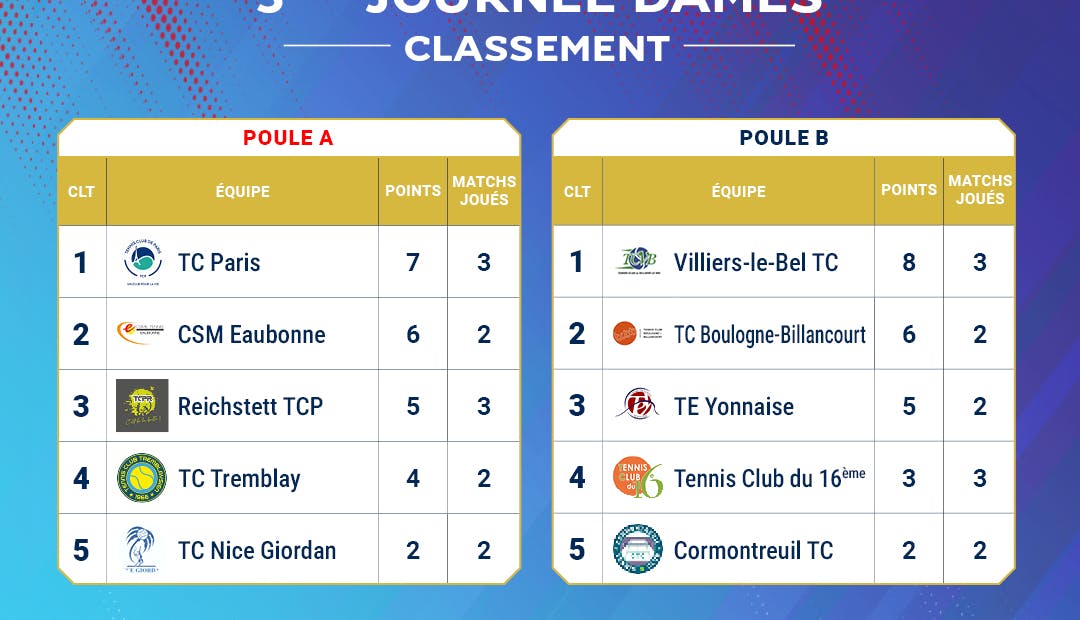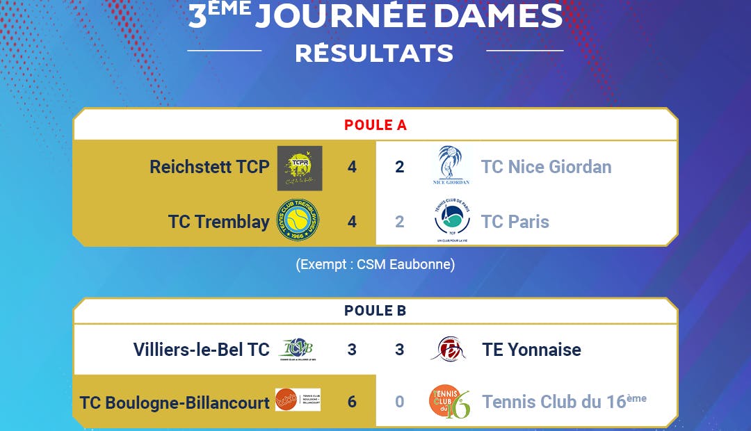Dans la poule B, le club de Villiers le Bel est toujours invaincu. Après deux victoires lors des deux premières journées, le club francilien a concédé le match nul face au Tennis Entente Yonnaise (3-3).