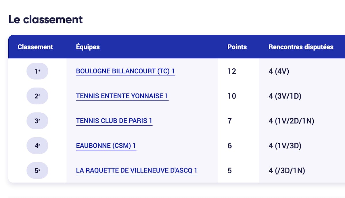 Dans l'autre rencontre de cette poule B, la Raquette Villeneuve d'Ascq et le TC Paris ont fait match nul (3/3).Fiona Ferro (n°9) a gagné son simple pour le TCP, tout comme Julie Gervais (n°40) pour le club nordiste qui termine dernier de la poule. La victoire en double de Fiona Ferro et de Margot Yerolymos (n°60) 10-8 au super tie-break a pesé dans le classement final...La feuille de match