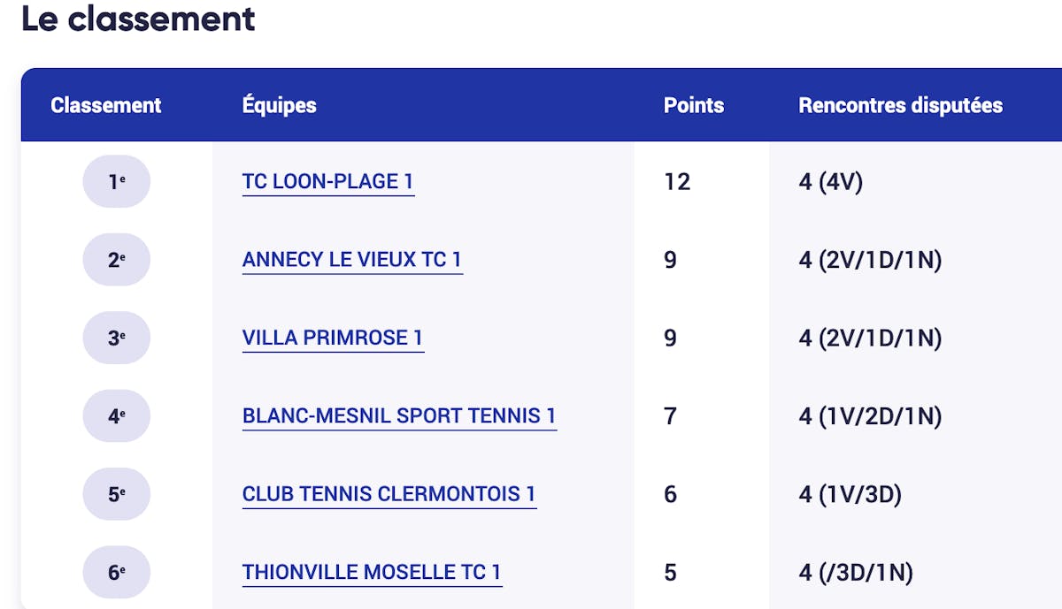 Dans les autres rencontres de cette poule A, la Villa Primrose est allée s'imposer 4/2 sur les courts du TC Thionville Moselle. Calvin Hemery (n°23) et Mathias Bourgue (n°27) ainsi qu'Edouard Roger-Vasselin, en double, ont participé au succès du club bordelais.La feuille de match