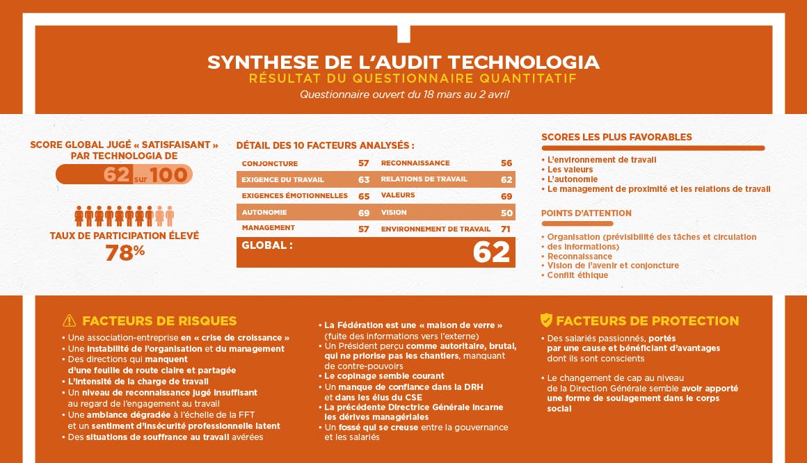 Sur demande du CSE de la Fédération, la gouvernance et la direction de la FFT ont mandaté conjointement avec le CSE, en avril 2024, le cabinet indépendant Technologia pour mener une enquête approfondie sur la situation sociale au sein de la Fédération. La première phase - quantitative - a constitué en l’envoi de 100 questions à l’ensemble des collaborateurs FFT. La seconde - qualitative - à la réalisation de 144 entretiens individuels avec des salariés tirés au sort, personnes volontaires, élus du CSE, la direction et le Président. Voici les principales conclusions de cet audit :